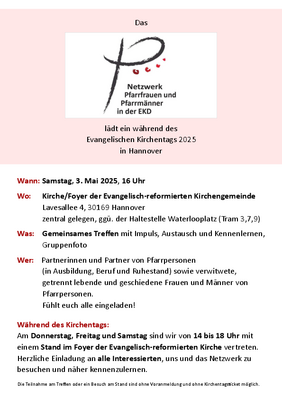 erstmals wird das Netzwerk Pfarrfrauen und Pfarrmänner der EKD mit einem Stand und einem Austauschtreffen beim